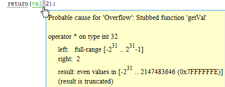 valis in a certain range.if(val < INT_MAX/2) return(val*2); else /* Alternate action */The probable root cause for overflow, if indicated in the tooltip.