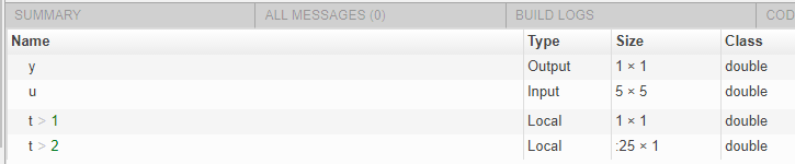 example1.mcontaining the following code.function y = example1(u) %#codegen if all(all(u>0)) % First, t is used to hold a scalar double value t = mean(mean(u)) / numel(u); u = u - t; end % t is reused to hold a vector of doubles t = find(u > 0); y = sum(u(t(2:end-1))); endGenerate a MEX function for