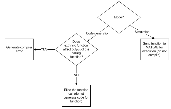 If you generate standalone code for a function that calls foo and includes coder.extrinsic('foo'), the code generator attempts to determine whether foo affects the output. If foo does not affect the output, the code generator proceeds with code generation, but excludes foo from the generated code. Otherwise, the code generator produces a compilation error.
