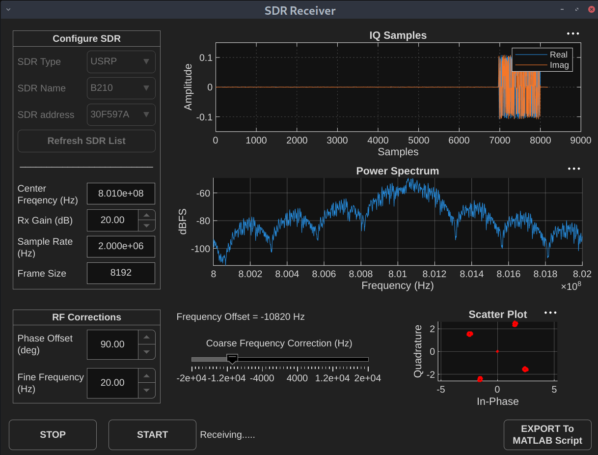 While using SDRs, the common challenges include setting the correct gain and estimating accurate frequency and phase offset values. The SDR Receiver app provides an interactive interface to tune the gain of the selected SDR. Additionally, the app also allows you to adjust the phase offset, fine frequency offset, and coarse frequency offset during signal reception and you can observe how each adjustment affects the received signal.