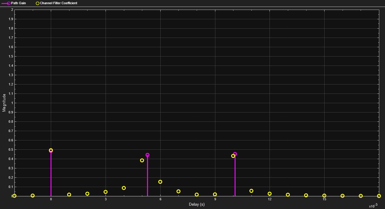 channel impulse response magnitude. For more information, see Channel Delay and Magnitude Computation.delay,mag] = channelDelay(pathGains,pathFilters)