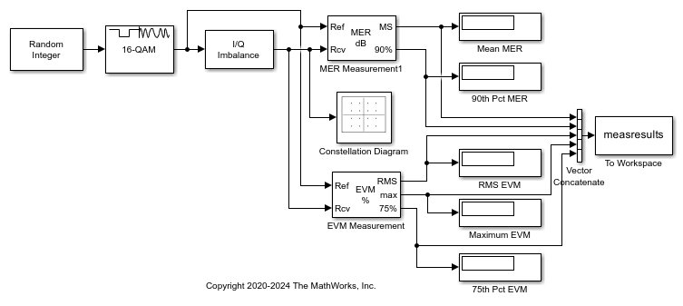 The EVM Measurement block measures the root mean squared (RMS) EVM, maximum EVM, and percentile EVM of a received signal. EVM is an indication of modulator or demodulator performance.
