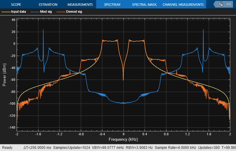 The spectrum analyzer plot shows input signal, the modulated signal, and the demodulated signal.