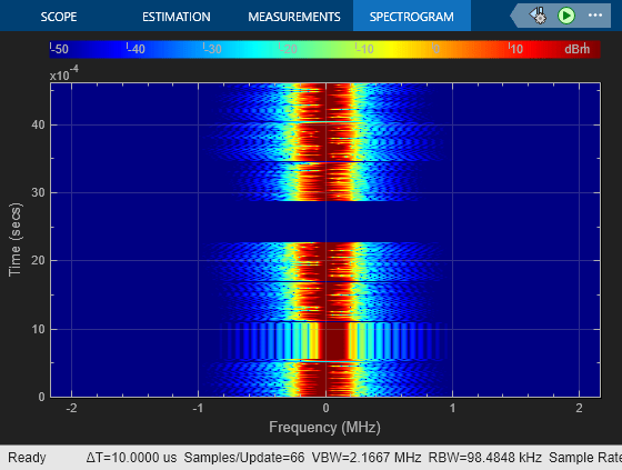 The model sample time of the MATLAB Function (Simulink) block is set to wfInfo.FrameLengthInSamples/wfInfo.SampleRate. To view the Sample time parameter, open the Block Parameters dialog box by right-clicking the MATLAB Function block and selecting Block Parameters (Subsystem).