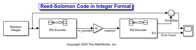 The Integer-Output RS Decoder block recovers a message vector from a Reed-Solomon codeword vector. For proper decoding, the parameter values in this block must match those in the corresponding Integer-Input RS Encoder block.