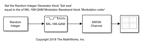 • The Modulation order setting in the MIL-188 QAM Modulator Baseband block. To set the Modulation order for the MIL-188 QAM Modulator Baseband block select a value from the dropdown list in the block mask.