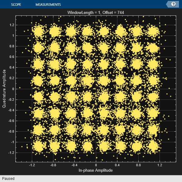 windowLenVec = [1 (cplen+1)]; for k = 1:length(windowLenVec) % Get timing estimate offset = timingEstimate(rxSignal,refSig,WindowLength=windowLenVec(k)); % Demodulate signal rxofdmData = ofdmdemod(rxSignal(offset+(1:symLen*numSym)), ... nfft,cplen,cplen,nullIdx).'; % Find the best possible equalizer by using % known data equalizerCoef = zeros(numDataCarrs,1); for n = 1:numDataCarrs equalizerCoef(n) = rxofdmData(:,n)\(ofdmData(n,1+(1:numSym)).'); end % Equalize signal eqData = rxofdmData*diag(equalizerCoef); % Plot constellation diagram for all subcarriers % Set WindowLength=cplen+1 leads to a timing estimate that reduces ISI constdiag{k} = comm.ConstellationDiagram(ShowReferenceConstellation=false); constdiag{k}.Title = ['WindowLength = ' num2str(windowLenVec(k))... ', Offset = ' num2str(offset)]; constdiag{k}(eqData(:)); end