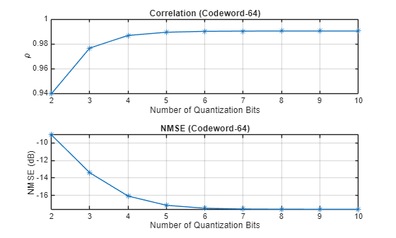 figure tiledlayout(2,1) nexttile plot(nBitsVec,squeeze(mean(rhoQ,[1 2])),'*-') title("Correlation (Codeword-" + size(codeword,3) + ")") xlabel("Number of Quantization Bits"); ylabel("\rho") grid on nexttile plot(nBitsVec,squeeze(mean(nmseQ,[1 2])),'*-') title("NMSE (Codeword-" + size(codeword,3) + ")") xlabel("Number of Quantization Bits"); ylabel("NMSE (dB)") grid on
