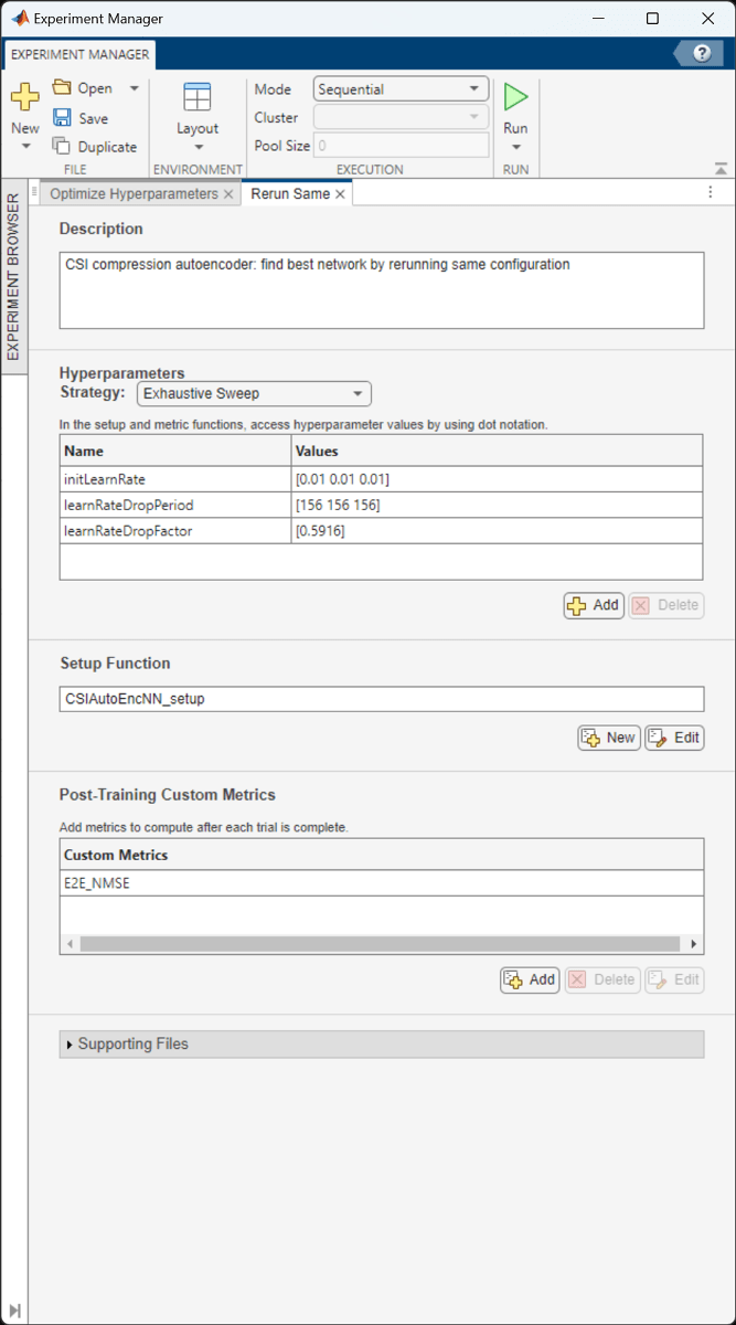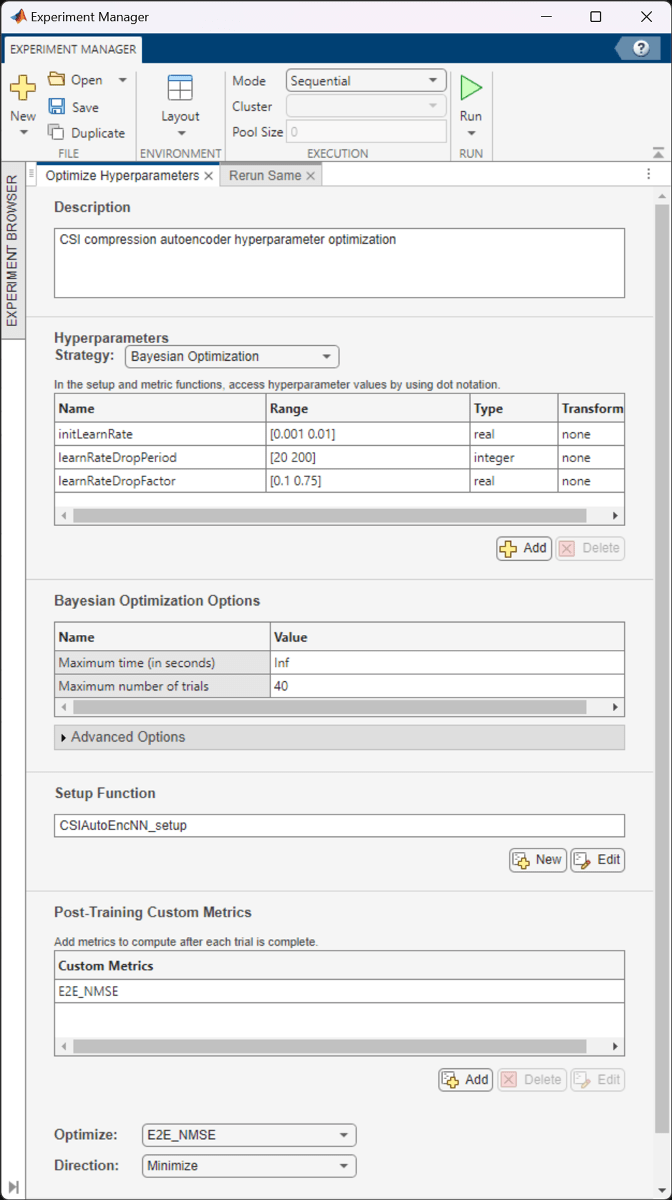The Optimize Hyperparameters experiment uses Bayesian optimization with hyperparameter search ranges specified as in the following figure. After you open the project, you can use the experiment setup function CSIAutoEncNN_setup and the custom metric function is E2E_NMSE.