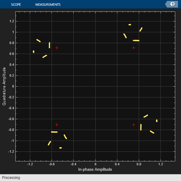 for n = 1:numTrials tx = randi([0 M-1],500,1); pskSig = pskmod(tx,M,phaseoffset); fadedSig = rayChan(pskSig); % Plot the new data for each for loop iteration. update(cd,fadedSig); end