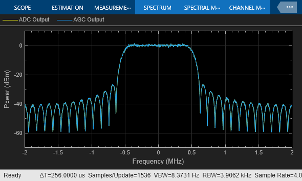 set_param(mdl, 'StopTime', '0.1'); saBlk = [mdl '/Spectrum Analyzer']; saCfg = get_param(saBlk, 'ScopeConfiguration'); saCfg.OpenAtSimulationStart = false; cdBlk = [mdl '/Rx Filter Output']; cdCfg = get_param(cdBlk, 'ScopeConfiguration'); cdCfg.OpenAtSimulationStart = true; sim(mdl);