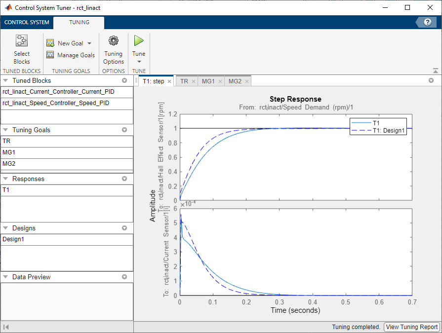 The Control System Tuner app tunes control systems modeled in MATLAB® or Simulink® (requires Simulink Control Design™ software). This app lets you tune any control system architecture to meet your design goals. You can tune multiple fixed-order, fixed-structure control elements distributed over one or more feedback loops.