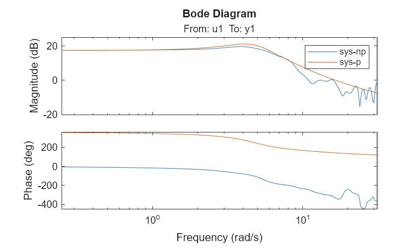 bodefunction plots the response only up to the Nyquist frequency ωN. Ifsysis a discrete-time model with an unspecified sample time, thebodefunction uses Ts = 1.