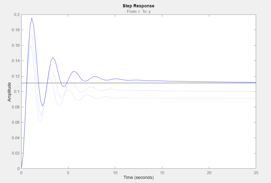The tuned controller produces a step response with minimal overshoot for the nominal models and a worst-case overshoot less than 10%.