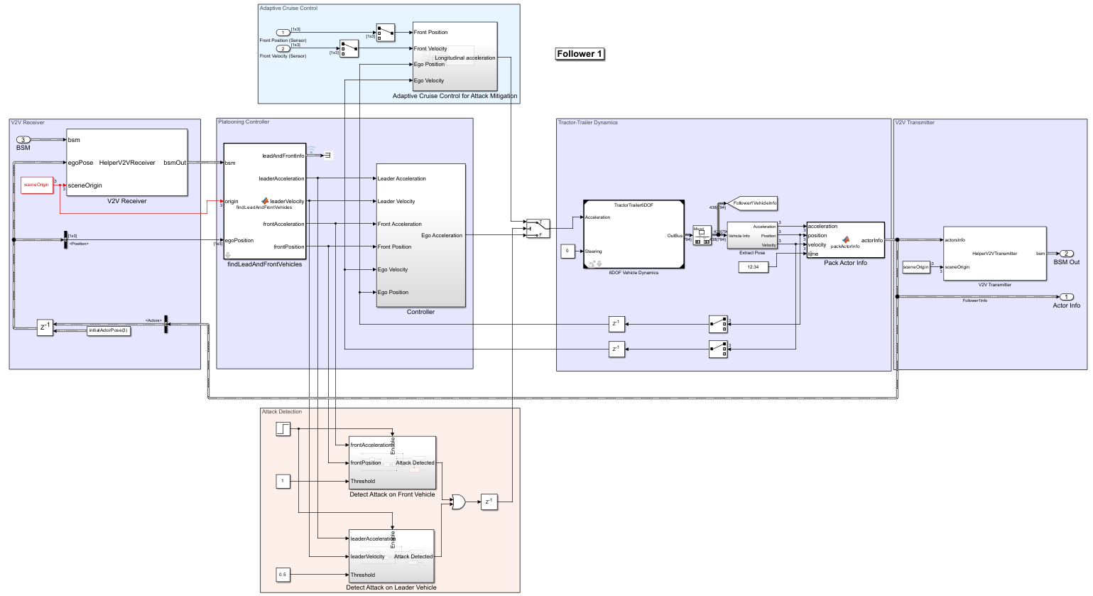 In the Simulink® model, the sensor information is modeled using the Actor Info output. The follower vehicles include Attack Detection (red) and Adaptive Cruise Control (light blue) subsystems, which allow the followers to switch controllers to generate the longitudinal acceleration.