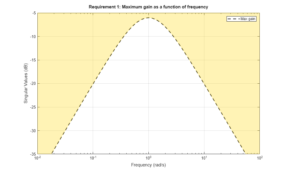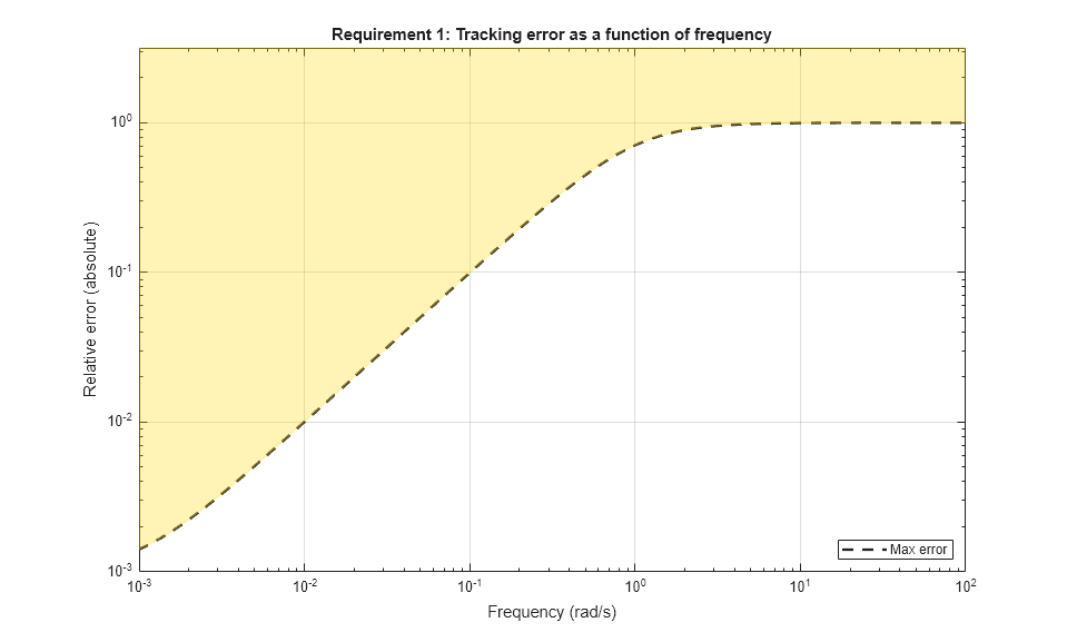 specifies that V should track Vsp and w should track wsp with minimum cross-coupling between the two responses. Tracking requirements are converted into frequency-domain constraints on the tracking error as a function of frequency. For the first requirement R1, for example, the gain from r to the tracking error e = r-y should be small at low frequency and approach 1 (100%) at frequencies greater than 1 rad/s (bandwidth for a two-second response time). You can use viewGoal to visualize this frequency-domain constraint. Note that the yellow region indicates where the requirement is violated.