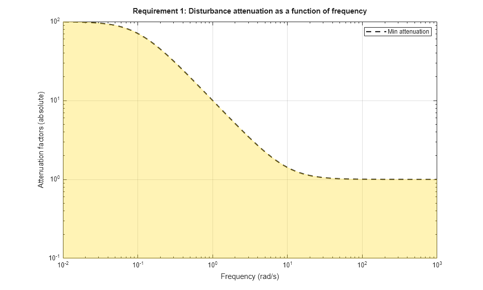 The TuningGoal.Rejection requirement specifies the disturbance attenuation as a function of frequency. The attenuation factor is greater than one inside the control bandwidth since feedback control reduces the impact of disturbances. As a rule of thumb, a 10-times-larger attenuation requires a 10-times-larger loop gain. For example