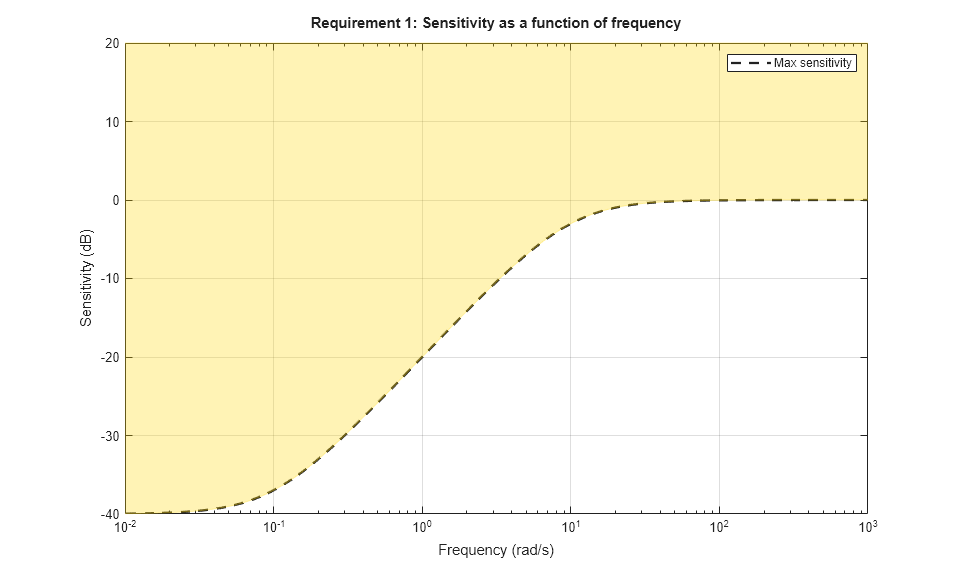 Instead of specifying the minimum attenuation, you can use the TuningGoal.Sensitivity requirement to specify the maximum sensitivity, that is, the maximum gain of