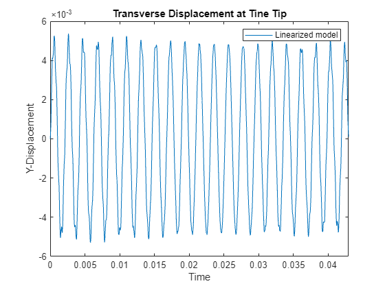 This example shows how to linearize the structural model of a tuning fork and calculate the time and frequency response when it is subjected to an impulse on one of the tines. This load results in transverse vibration of the tines and axial vibration of the end handle at same frequency. For more details about the structural model, see Structural Dynamics of Tuning Fork (Partial Differential Equation Toolbox).