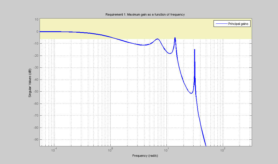 The shaded region indicates where the constraint is violated. After tuning, for a tuned model T, you can use viewGoal(R,T) to see the tuned frequency-dependent margins on this plot.