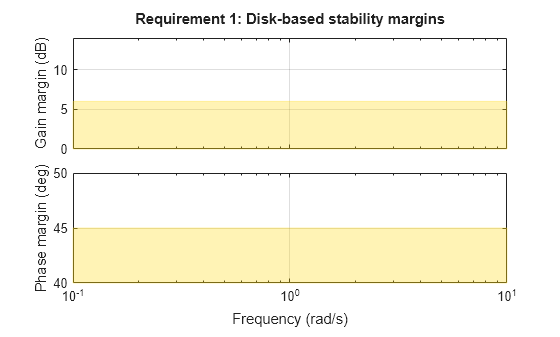 The TuningGoal.Margins requirement uses the notion of disk margin to enforce minimum amounts of gain and phase margins at the specified loop opening site(s). For MIMO feedback loops, this requirement guarantees stability for gain or phase variations in each feedback channel. The gain or phase can change in all channels simultaneously, and by a different amount in each channel. See Stability Margins in Control System Tuning for details. For example,the following code enforces ±6 dB of gain margin and 45 degrees of phase margin at a location "u".