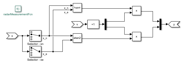 are not simply added to the measurements, but instead they depend on the states x. In this example, the radar measurement equation is implemented using a Simulink Function block.