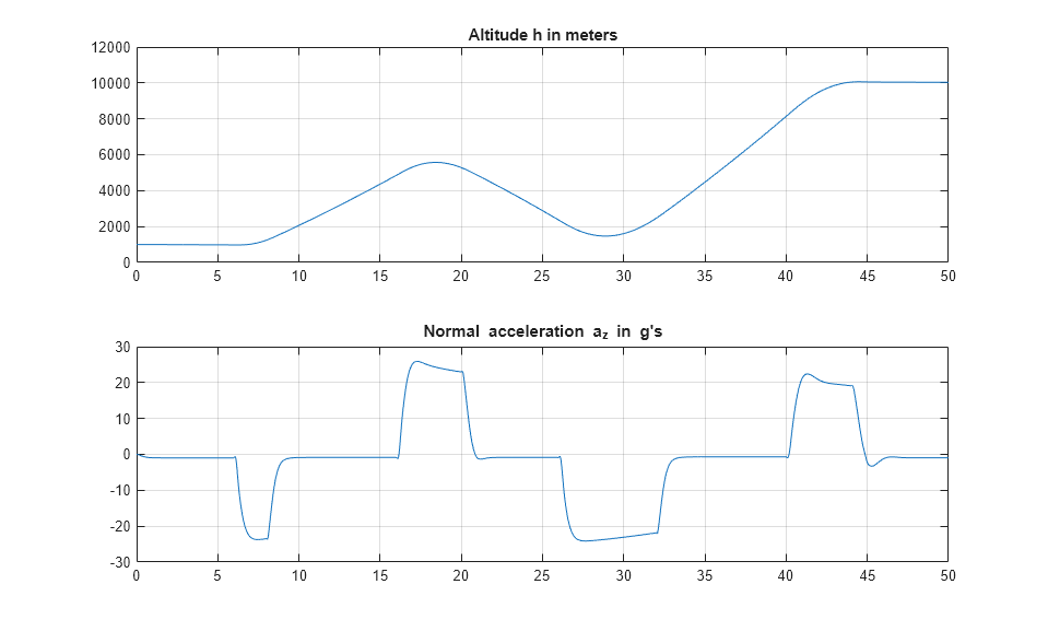 subplot(2,1,1) plot(t,Sim_h.Values.Data) grid title('Altitude h in meters') subplot(2,1,2) plot(t,Sim_az.Values.Data) grid title('Normal acceleration a_z in g''s')