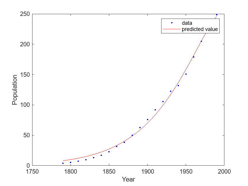 plot(exp_tr,cdate,pop) legend(["data","predicted value"]) xlabel("Year") ylabel("Population")