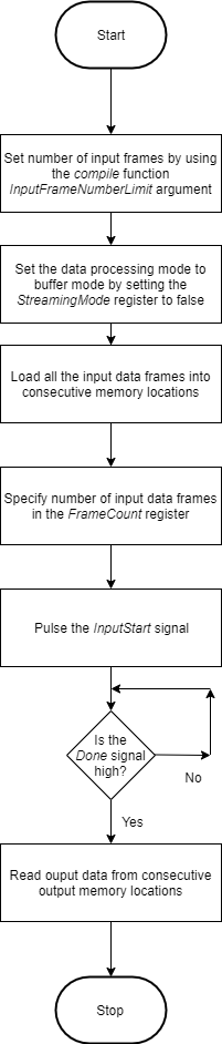 FrameCountregister value to one.Continuous streaming mode— In this mode the deep learning processor IP core processes data frames until you set the