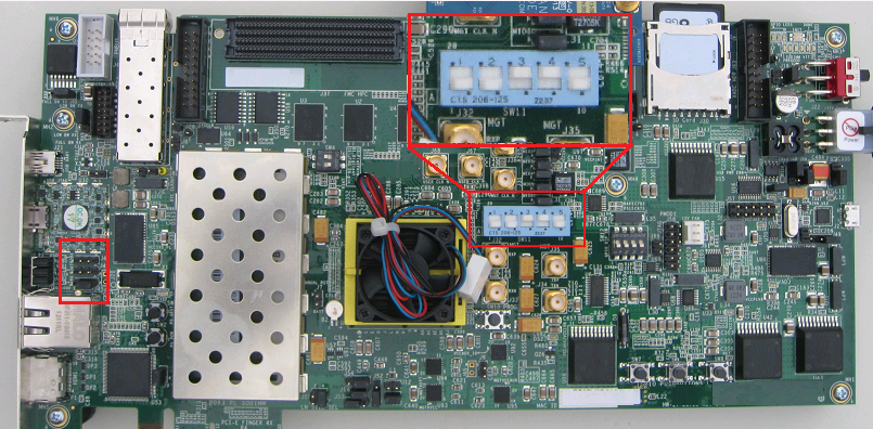 Configure the jumpers on the Zynq development board so that you can use it as a peripheral device. These jumper settings ensure that the board starts up from the SD card. Make sure that the board is turned off.