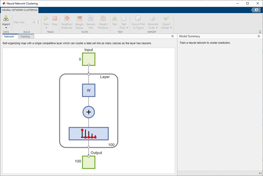To create the network, specify the map size, this corresponds to the number of rows and columns in the grid. For this example, set the Map size value to 10, this corresponds to a grid with 10 rows and 10 columns. The total number of neurons is equal to the number of points in the grid, in this example, the map has 100 neurons. You can see the network architecture in the Network pane.