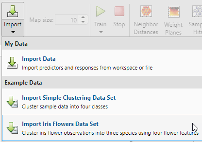 To import the example iris flower clustering data, select Import > Import Iris Flowers Data Set. If you import your own data from file or the workspace, you must specify the predictors and whether the observations are in rows or columns.