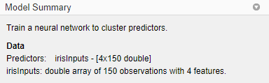 Information about the imported data appears in the Model Summary. This data set contains 150 observations, each with four features.