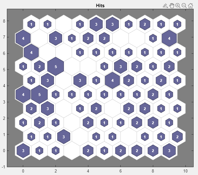 To plot the SOM Sample Hits, in the Plots section, click Sample Hits. This figure shows the neuron locations in the topology, and indicates how many of the observations are associated with each of the neurons (cluster centers). The topology is a 10-by-10 grid, so there are 100 neurons. The maximum number of hits associated with any neuron is 5. Thus, there are 5 input vectors in that cluster.