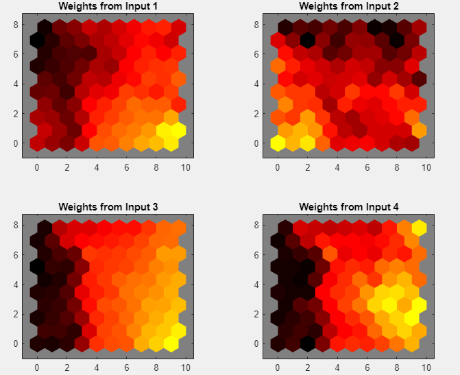 Plot the weight planes (also referred to as component planes). In the Plots section, click Weight Planes. This figure shows a weight plane for each element of the input features (four, in this example). The plot shows the weights that connect each input to each of the neurons, with darker colors representing larger weights. If the connection patterns of two features are very similar, you can assume that the features are highly correlated.