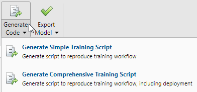 You can export your trained network to the workspace or Simulink®. You can also deploy the network with MATLAB Compiler™ tools and other MATLAB code generation tools. To export your trained network and results, select Export Model > Export to Workspace.