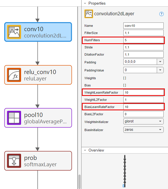 Set the NumFilters property to the new number of classes — in this example, 5. Change the learning rates so that learning is faster in the new layer than in the transferred layers by setting WeightLearnRateFactor and BiasLearnRateFactor to 10.