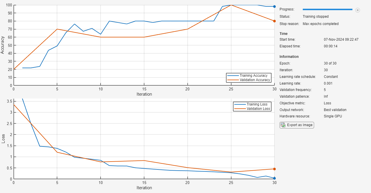 options = trainingOptions("adam", ... ValidationData=imdsValidation, ... ValidationFrequency=5, ... Plots="training-progress", ... Metrics="accuracy", ... Verbose=false);