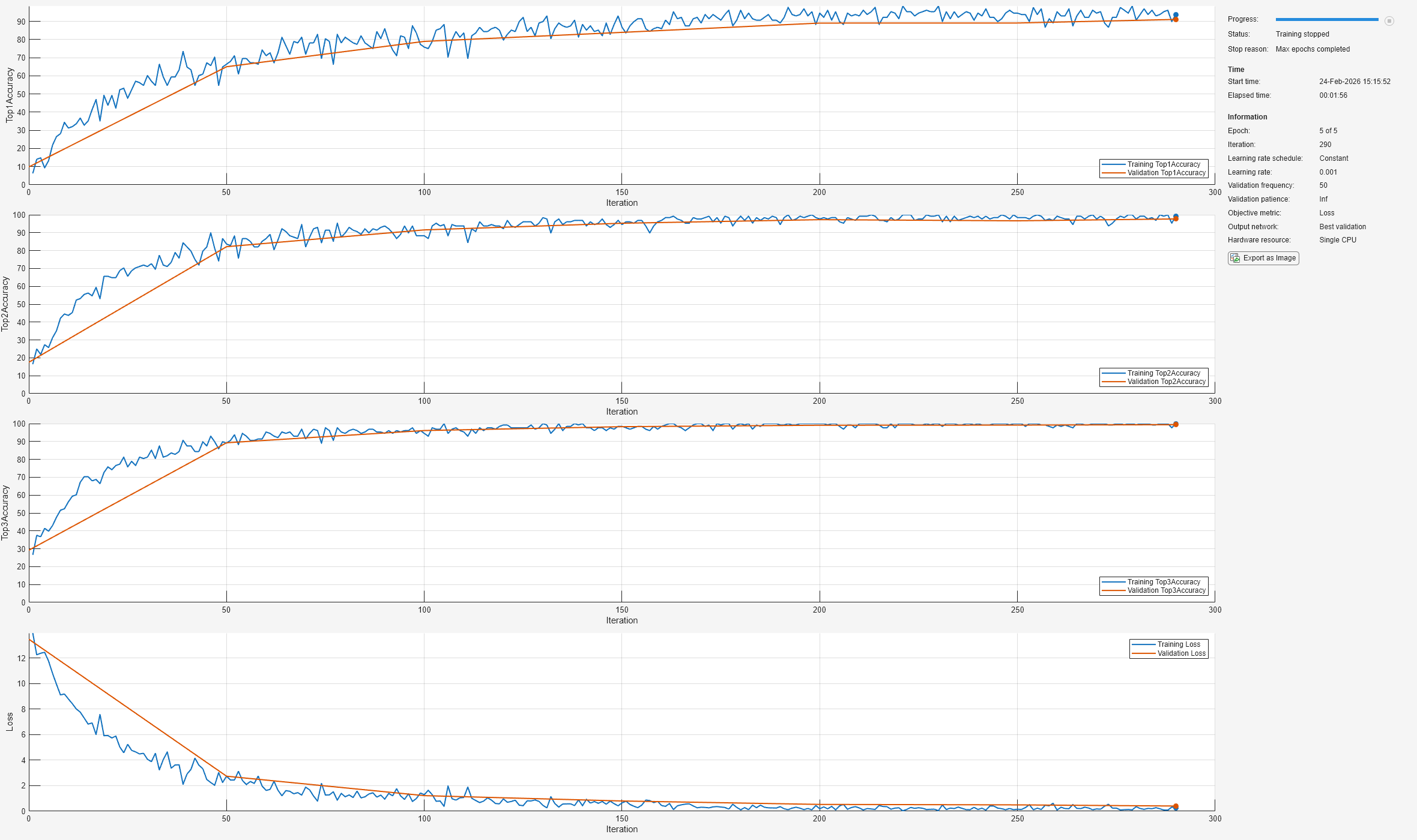 Iteration    Epoch    TimeElapsed    LearnRate    TrainingLoss    ValidationLoss    TrainingAccuracy    ValidationAccuracy