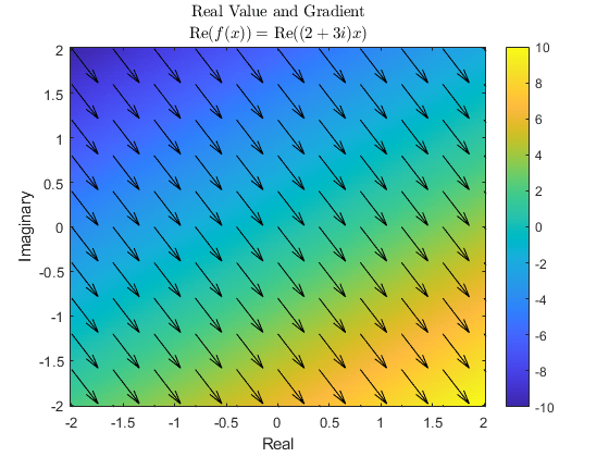 However, the function Re(f(x)) is not analytic, and therefore no complex derivative is defined. For automatic differentiation in MATLAB, the value to differentiate must always be real, and therefore the function can never be complex analytic. Instead, the derivative is computed such that the returned gradient points in the direction of steepest ascent, as seen in the plot. This is done by interpreting the function Re(f(x)): C R as a function Re(f(xR+ixI)): R × R R.