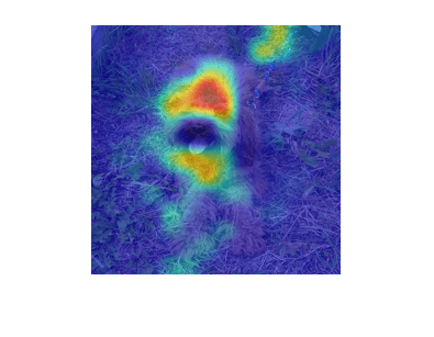 The Grad-CAM interpretability technique uses the gradients of the classification score with respect to the final convolutional feature map. The parts of an observation with a large value for the Grad-CAM map are those that most impact the network score for that class.