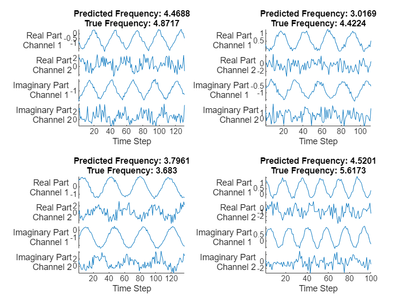 TPred = minibatchpredict(net,XTest, ... SequencePaddingDirection="left", ... InputDataFormats="CTB"); numChannels = 2; displayLabels = [ ... "Real Part" + newline + "Channel " + string(1:numChannels), ... "Imaginary Part" + newline + "Channel " + string(1:numChannels)]; figure tiledlayout(2,2) for i = 1:4 nexttile stackedplot([real(XTest{i}') imag(XTest{i}')], DisplayLabels=displayLabels); xlabel("Time Step") title(["Predicted Frequency: " + TPred(i);"True Frequency: " + TTest(i)]) end