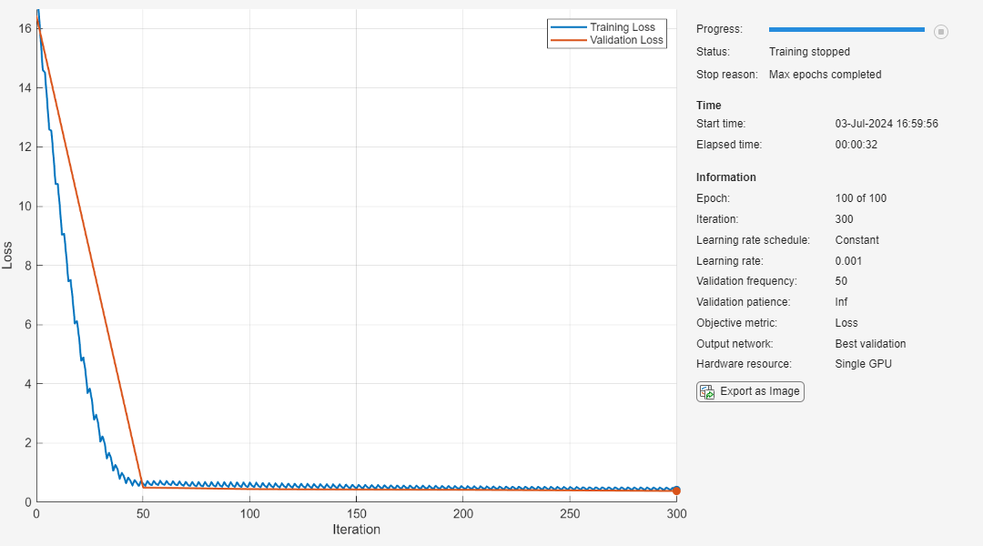 options = trainingOptions("adam", ... InputDataFormats="CTB", ... MaxEpochs=100, ... L2Regularization=0.1, ... ValidationData={XValidation, TValidation}, ... OutputNetwork="best-validation-loss", ... Plots="training-progress", ... Verbose=false); netPruned = trainnet(XTrain,TTrain,netPruned,"mse",options);