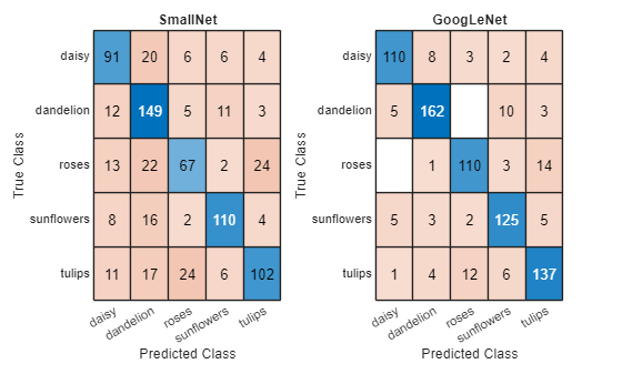 Plot confusion charts for each mode. For each class, the GoogLeNet network performs better than the smaller network. Both networks have the greatest difficulty in classifying images from the daisy and rose classes.