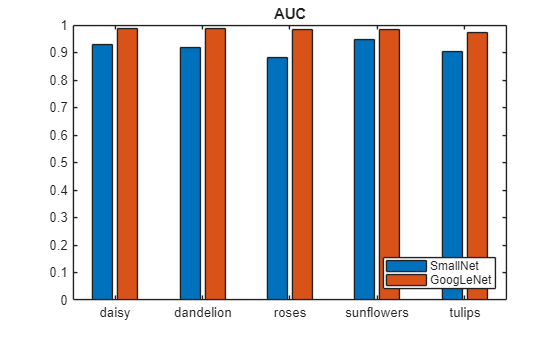 Figure contains an axes object. The axes object with title AUC contains 2 objects of type bar. These objects represent SmallNet, GoogLeNet.