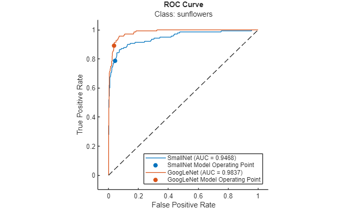 Investigate the ROC curves for the sunflowers class. By default, the plot function displays the class names and the AUC values in the legend. To include the model names in the legend instead of the class names, modify the DisplayName property of the ROCCurve object that the plot function returns. The model operating point represents the FPR and TPR corresponding to the typical threshold value. For the sunflower class, both models are performing well.