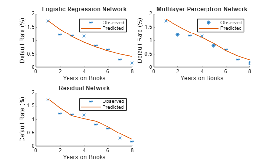 networks = ["Logistic Regression Network","Multilayer Percerptron Network","Residual Network"]; figure tiledlayout('flow','TileSpacing','compact') for i = 1:3 nexttile scatter(summaryYOB.YOB,summaryYOB.mean_Default*100,'*'); hold on plot(summaryYOB.YOB,summaryYOB{:,i+3}*100); hold off title(networks(i)) xlabel('Years on Books') ylabel('Default Rate (%)') legend('Observed','Predicted') end