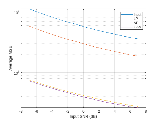 figure semilogy(SNRs,[MSE_in MSE_LP MSE_AE MSE_GAN]) legend(["Input" "LP" "AE" "GAN"],Location="Northeast") ylabel("Average MSE") xlabel("Input SNR (dB)") grid on