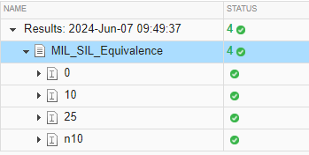 To run the tests, open Test Manager with BSOCSimulinkIntegrationTestSIL. Select MIL_SIL_Equivalence. This test checks that the SIL simulation and the Simulink model are within 1e-7 of each other. To run the test, click Run.