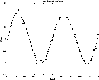 The following figure shows the response of a 1-20-1 neural network that has been trained to approximate a noisy sine function. The underlying sine function is shown by the dotted line, the noisy measurements are given by the + symbols, and the neural network response is given by the solid line. Clearly this network has overfitted the data and will not generalize well.
